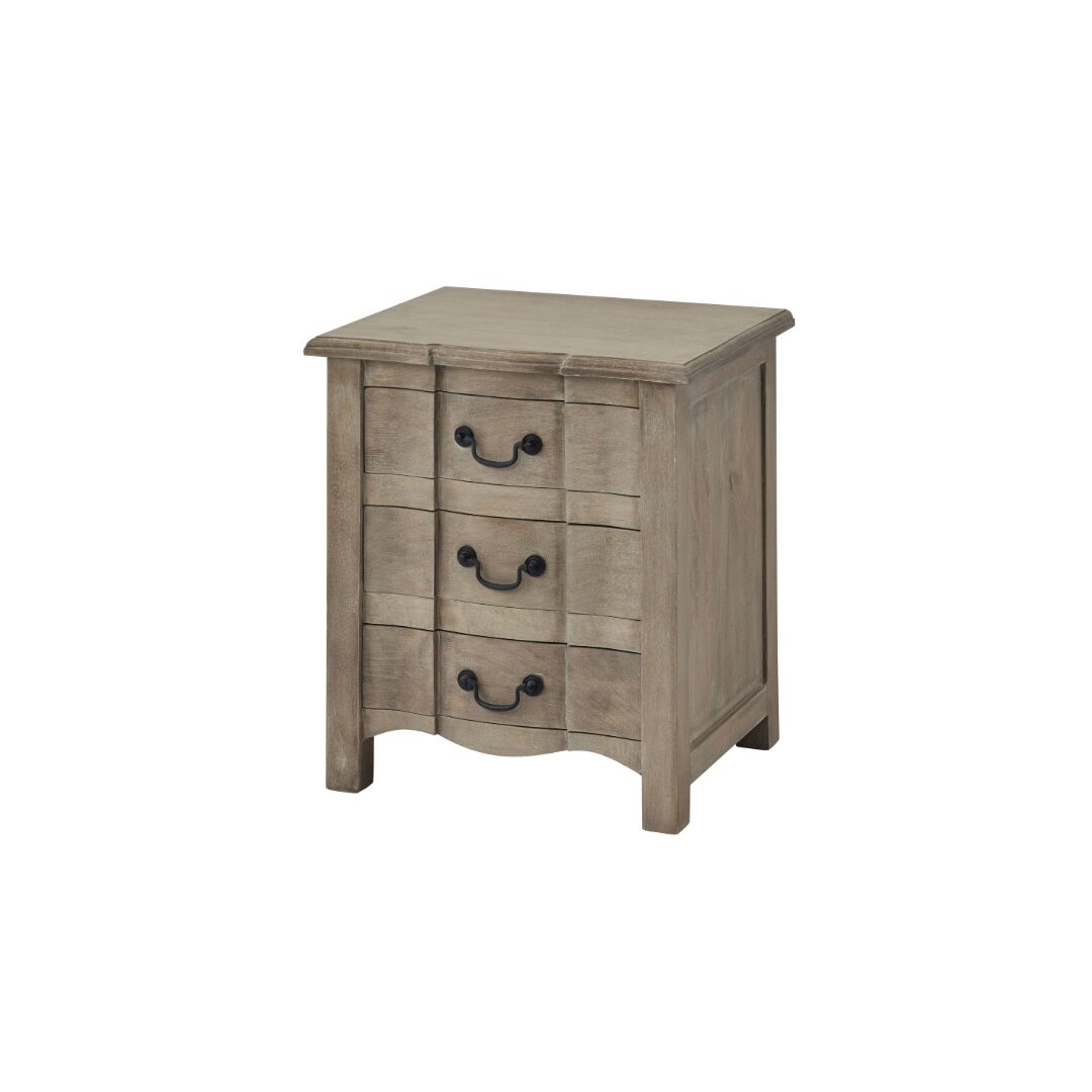 The COPGROVE 3 Drawer Bedside Table complements a variety of bedroom interiors. Pair it with matching beds or other Copgrove furniture pieces for a coordinated French-inspired look. Its neutral brown, washed wood finish enhances natural décor, linen, and textiles, while the elegant design works seamlessly in both modern and traditional spaces. Ideal for bedrooms, guest rooms, or boutique hotel interiors.