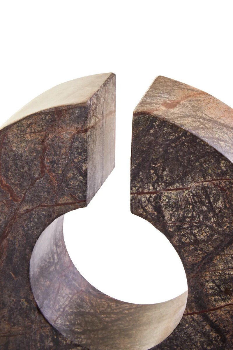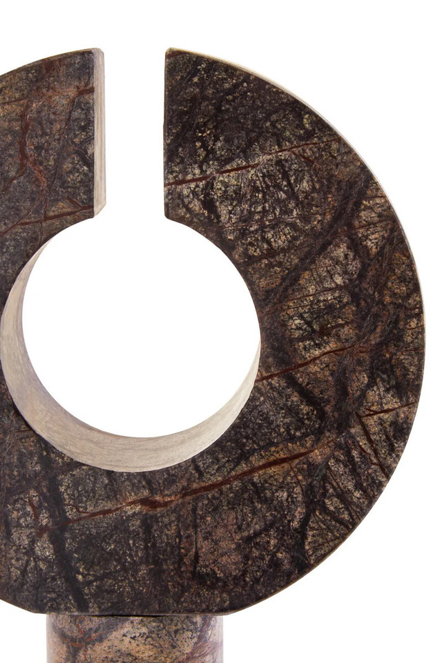 Expertly carved from 100% marble, this sculpture showcases refined craftsmanship and timeless durability. In addition, the distinctive silhouette features a circular cut-out balanced on a cylindrical base, so it creates visual harmony, depth, and architectural interest. The natural marble patterning adds unique texture and character, while the polished surface enhances the richness of the stone beautifully.