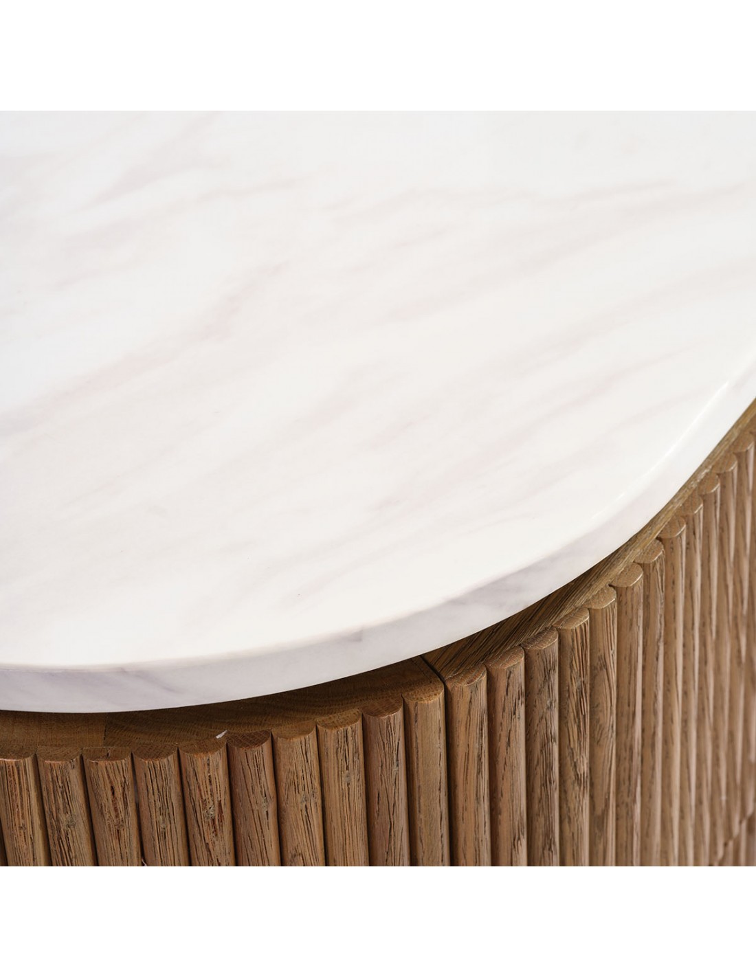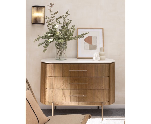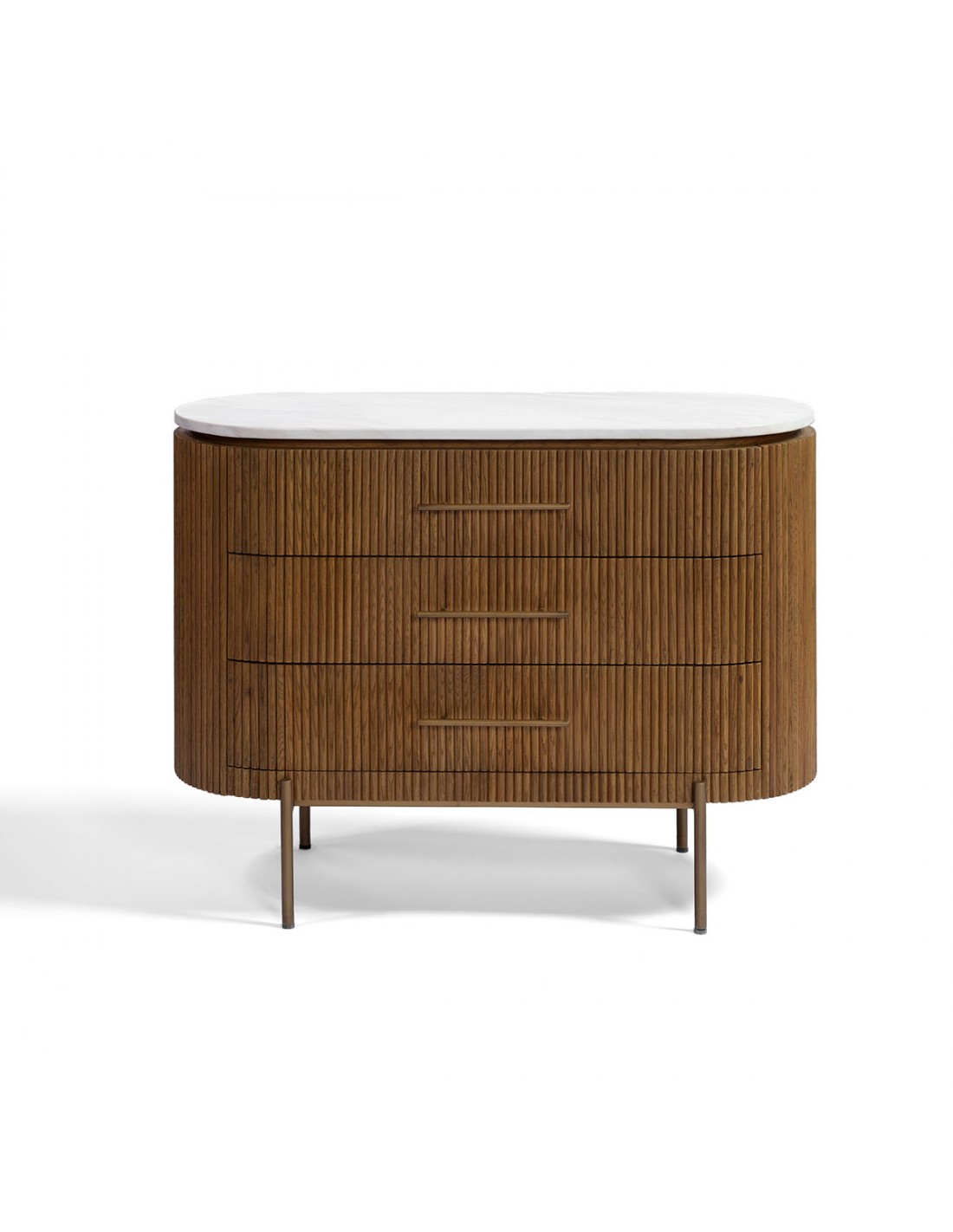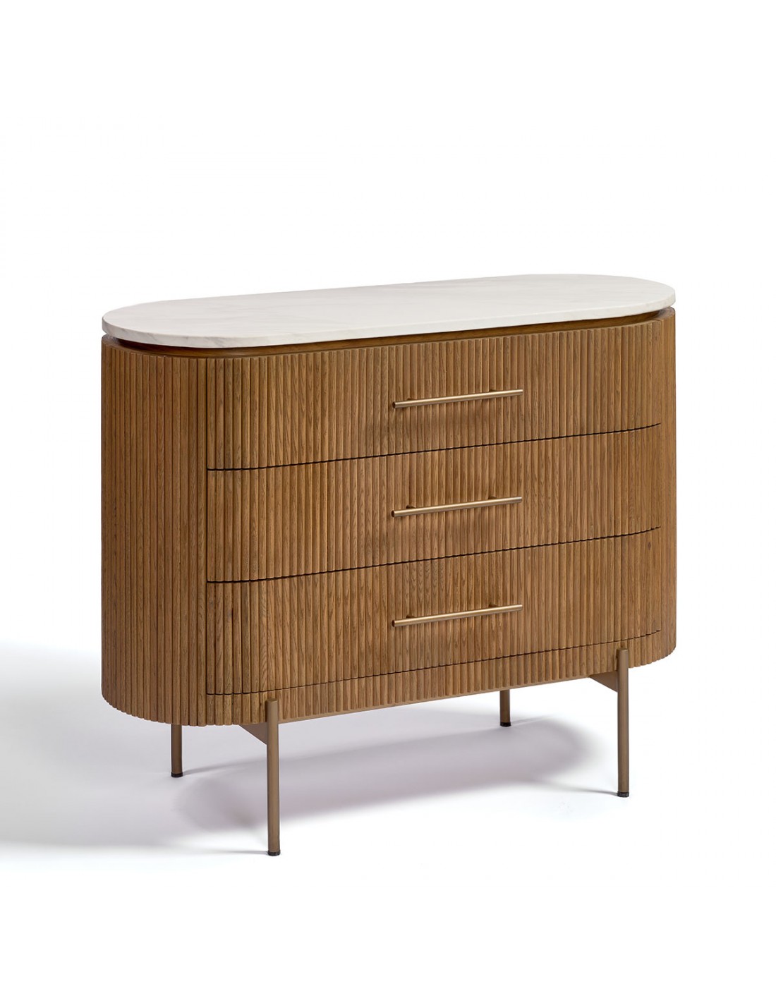The MARIETA White Marble Chest of Drawers combines timeless craftsmanship with modern sophistication. Featuring a smooth oval silhouette, this elegant dresser pairs a natural oak wood frame with an exquisite white marble top. Finished with antique gold-tone metal handles and legs, it brings warmth and refined elegance to bedrooms, hallways, or living spaces.