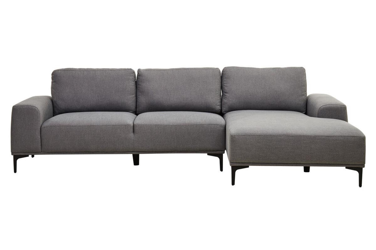 The NELSON Sofa combines modern elegance with unparalleled comfort, making it the perfect centrepiece for any living space. Designed with a laid-back aesthetic, it offers ample seating with three spacious seats and a left-facing chaise for ultimate relaxation. Upholstered in soft grey fabric, the sofa’s sleek design is complemented by sturdy black metal legs, blending style and functionality seamlessly. Whether for lounging, entertaining, or family time, the NELSON Sofa is a versatile addition that enhances any décor with its timeless and contemporary appeal.