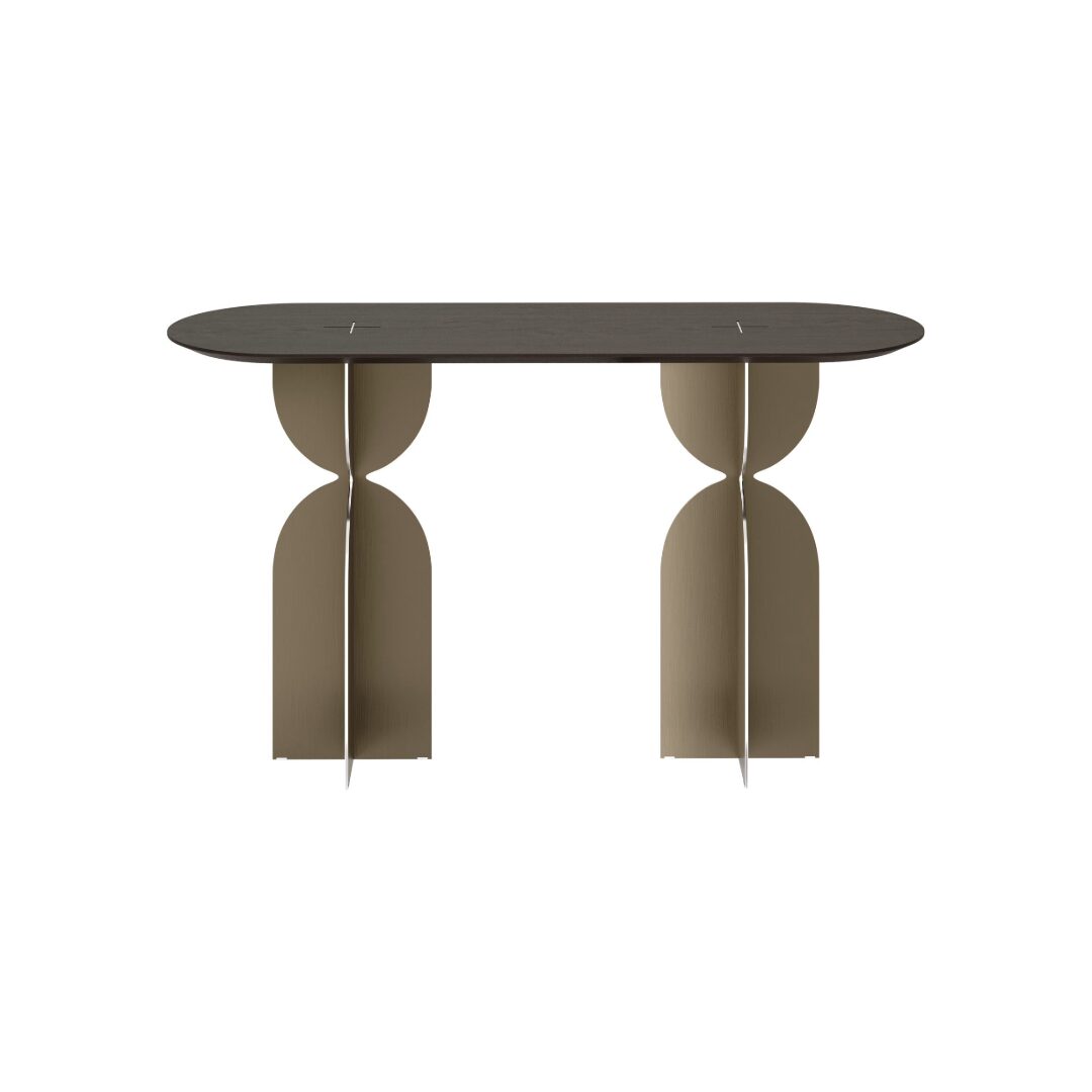 This designer console table blends functionality with contemporary style. The bold geometric lines of the stainless steel base create a sculptural focal point, while the oak veneer top offers a warm and refined finish. Ideal for displaying décor, lamps, or artwork, it’s a statement piece that enhances both modern and luxury interiors.