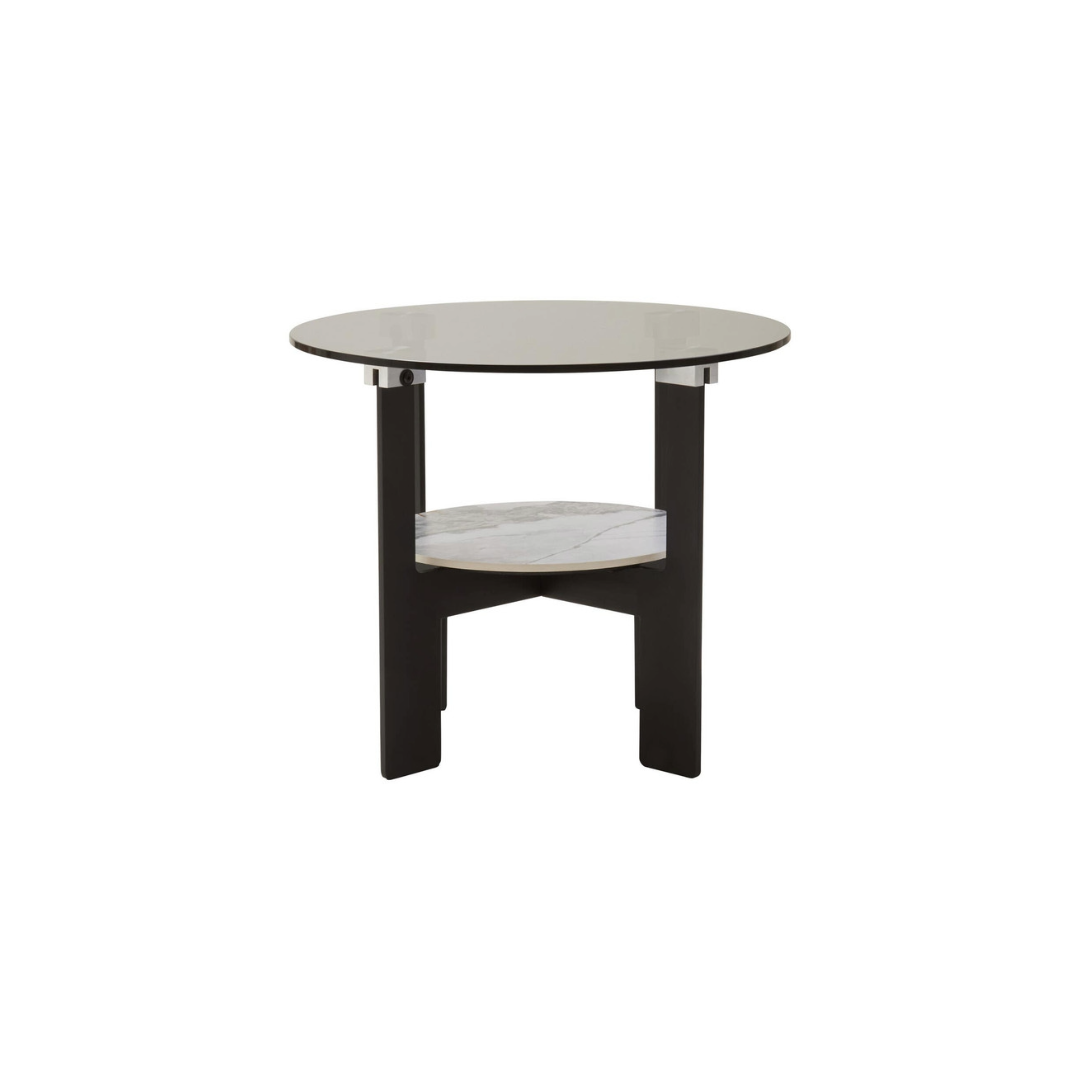 The VIONA Small Ceramic and Glass Coffee Table blends modern elegance with functional design. Featuring a sleek grey glass top and a lower white ceramic shelf with a marble effect, this round coffee table brings a sophisticated touch to living spaces. Its black coated iron legs add bold contrast and ensure long-lasting durability.