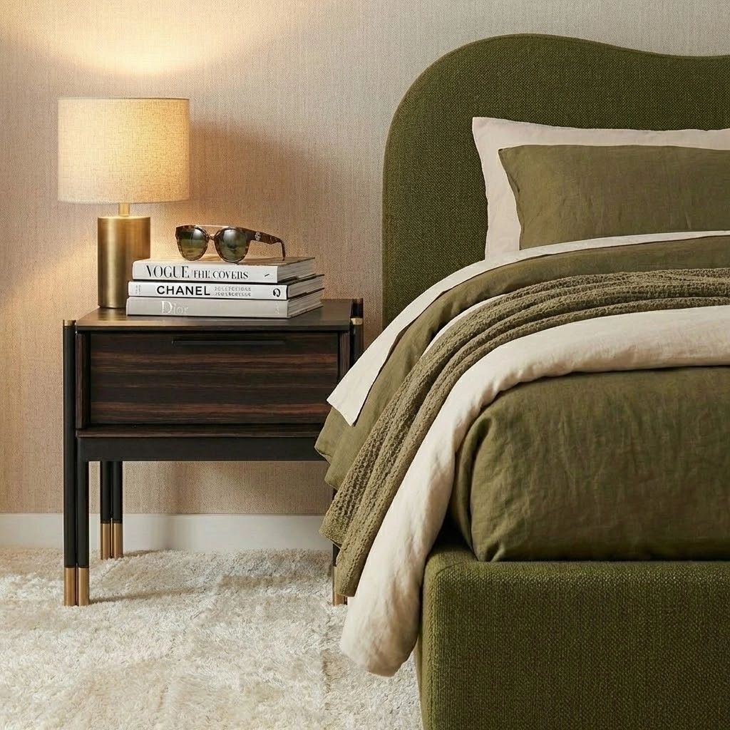 Designed for both residential homes and modern rental flats, this olive upholstered bed combines durability with refined design.